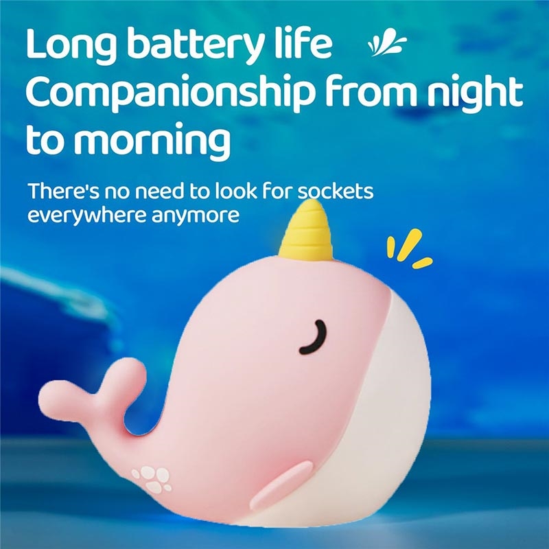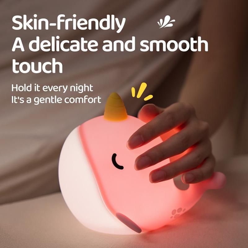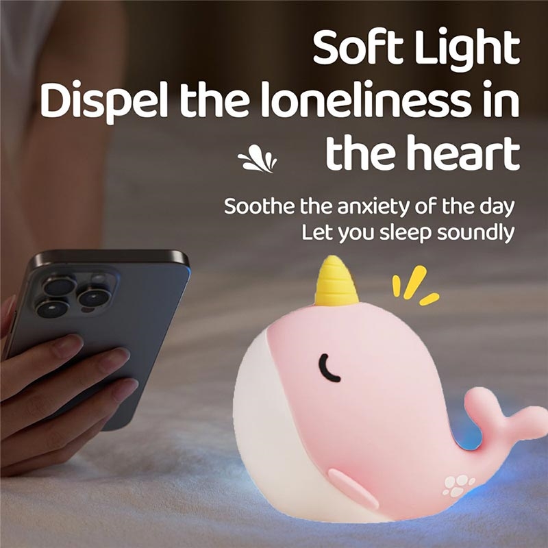 A044 Luz nocturna de silicone Narwhal - Controlo por toque, recarregável por USB-C e brilho ambiente suave