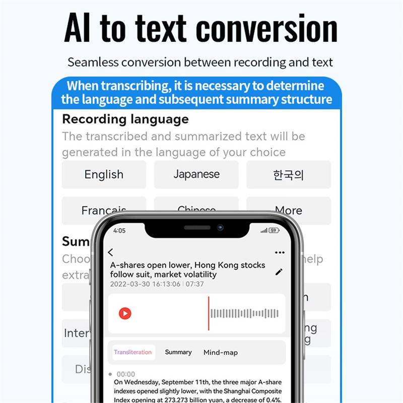 Emparelhado com o AIREC-APP via Bluetooth, este ditafone pode transcrever a fala em texto em tempo real em 188 idiomas. Também oferece traduções instantâneas, tornando-o uma ferramenta essencial para quebrar as barreiras linguísticas em negócios ou viagens.