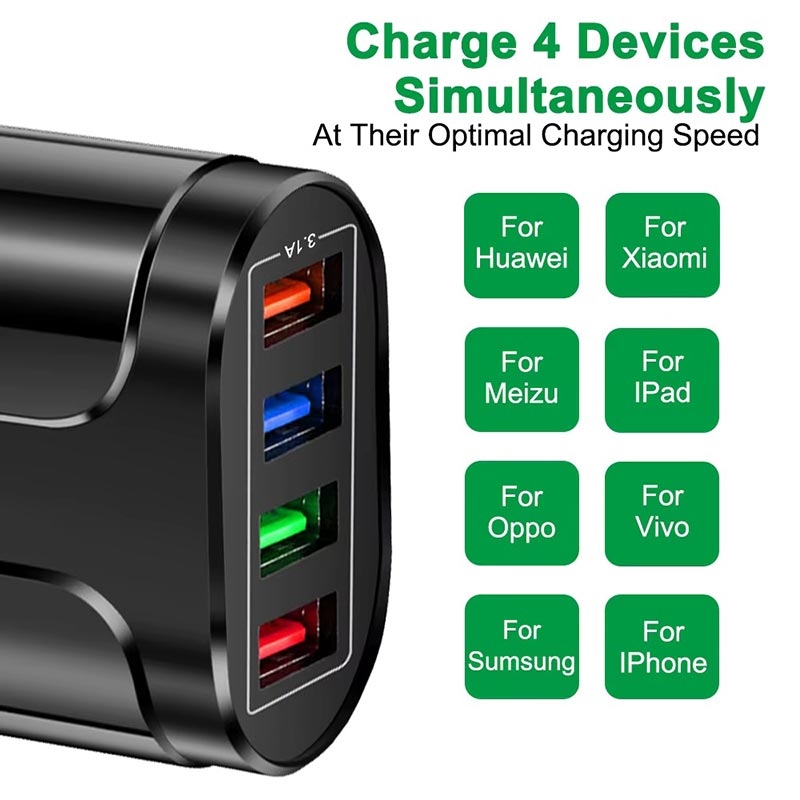 Graças ao chip inteligente incorporado, o adaptador universal de alimentação USB de 4 portas carrega os seus dispositivos mais rapidamente e com maior estabilidade. Está equipado com 4 portas USB de saída, para que possa carregar rapidamente até quatro dispositivos em simultâneo. Devido ao seu tamanho leve e compacto, pode levá-lo para todo o lado.