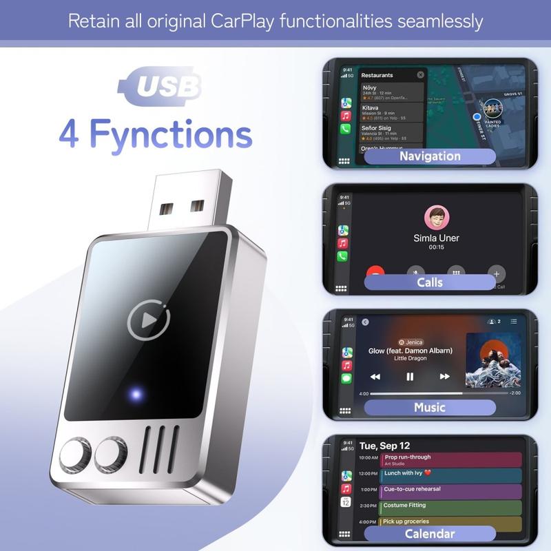 O adaptador suporta totalmente todas as funcionalidades originais do CarPlay, incluindo navegação, chamadas telefónicas, transmissão de música, mensagens e acesso ao calendário. A sua experiência de condução permanece familiar, apenas sem o cabo.