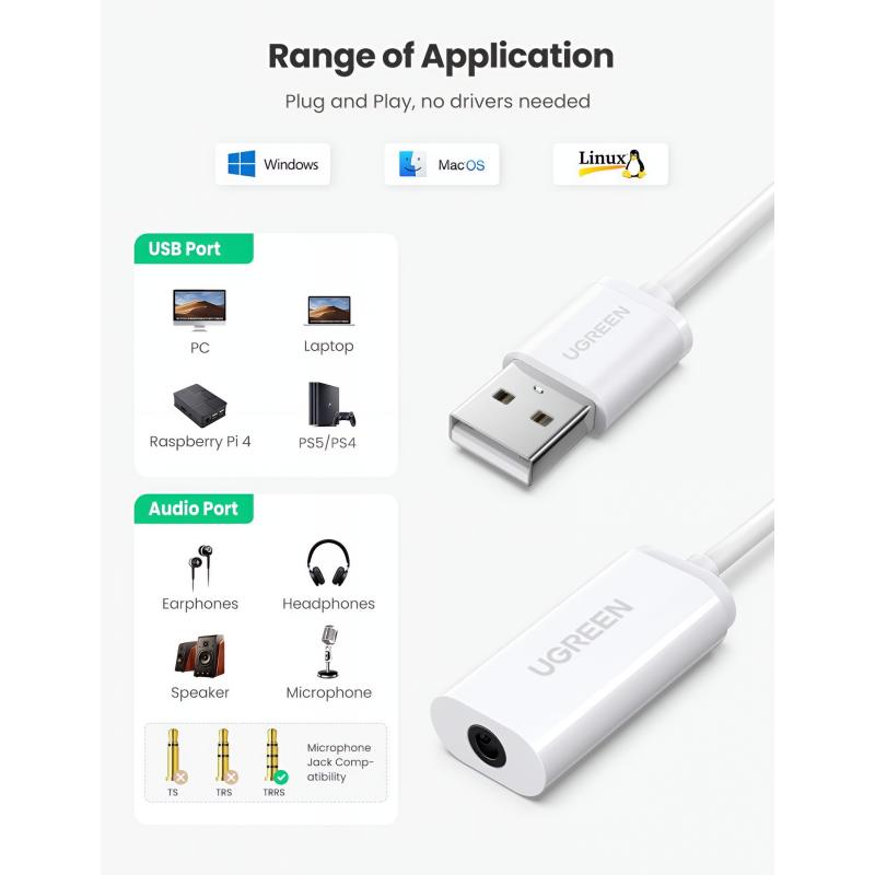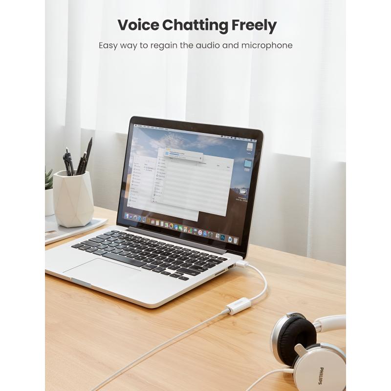 O adaptador de áudio USB UGREEN US206 adiciona uma conexão de fone de ouvido TRRS de 3.5mm a dispositivos que não possuem um conector de áudio dedicado ou têm uma porta danificada. Ele suporta saída de áudio e entrada de microfone através de um único conector de 3.5mm, tornando-o ideal para fones de ouvido, reuniões online, jogos e comunicação diária. Com operação plug and play simples e ampla compatibilidade com sistemas, ele oferece uma solução de áudio confiável e conveniente sem drivers adicionais.