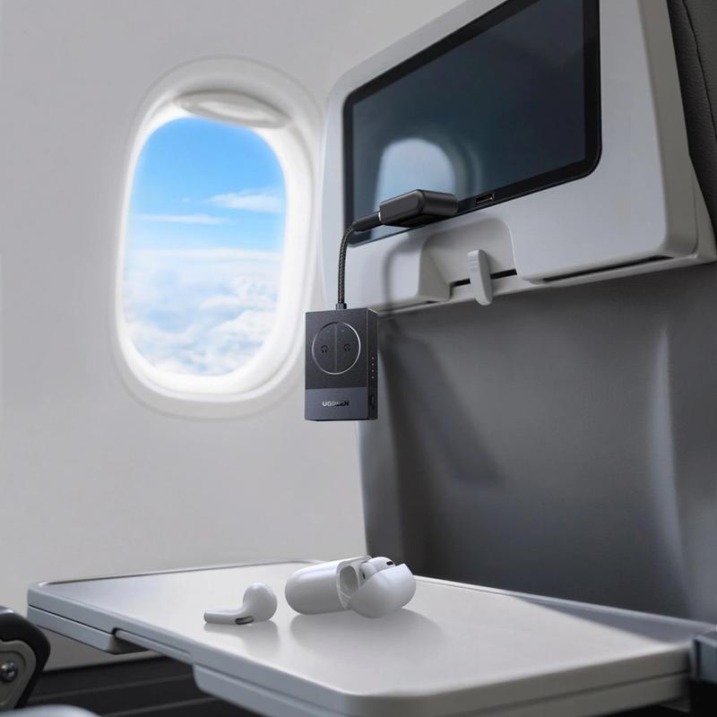 O design com duas tomadas de 3.5mm torna-o especialmente útil para aviões e audição partilhada. Pode emparelhar dois auscultadores Bluetooth ao mesmo tempo, para que duas pessoas possam assistir ou ouvir juntas a partir de uma única fonte. A bateria integrada proporciona até 19 horas de utilização e o carregamento USB-C facilita a recarga com carregadores modernos. Os indicadores LED e os botões dedicados simplificam o emparelhamento e a verificação do estado quando está a viajar.