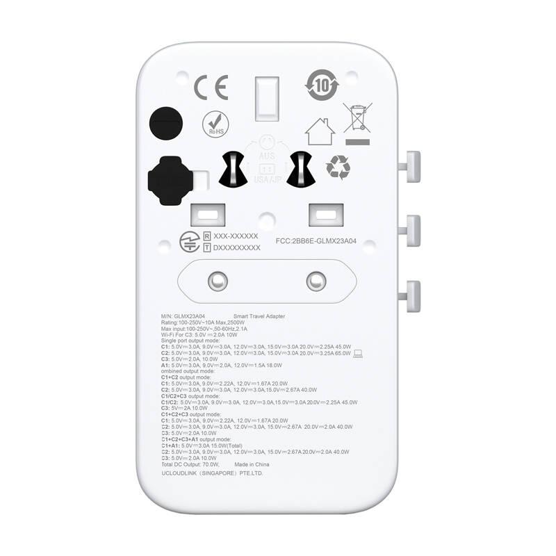 Adaptador de viagem GlocalMe RoamPlug com ponto de acesso Wi-Fi 4G/LTE - 70W, UE, Reino Unido, JP, CN, EUA, AUS, 3x USB-C, 1x USB-A