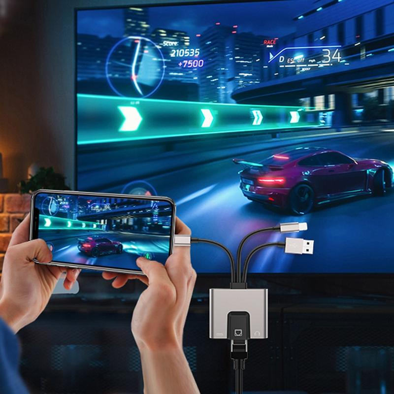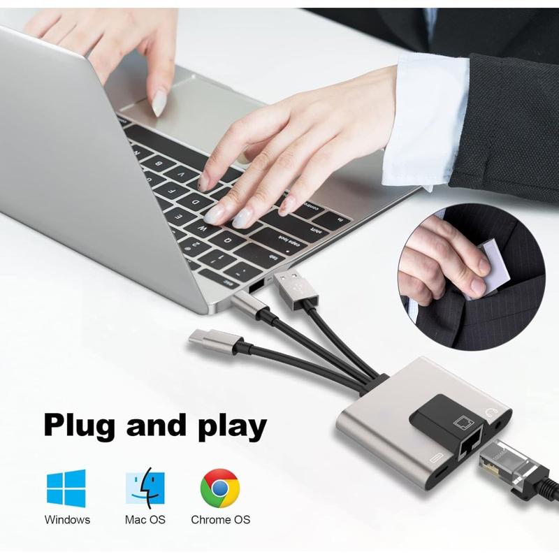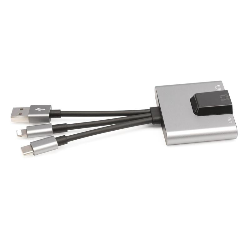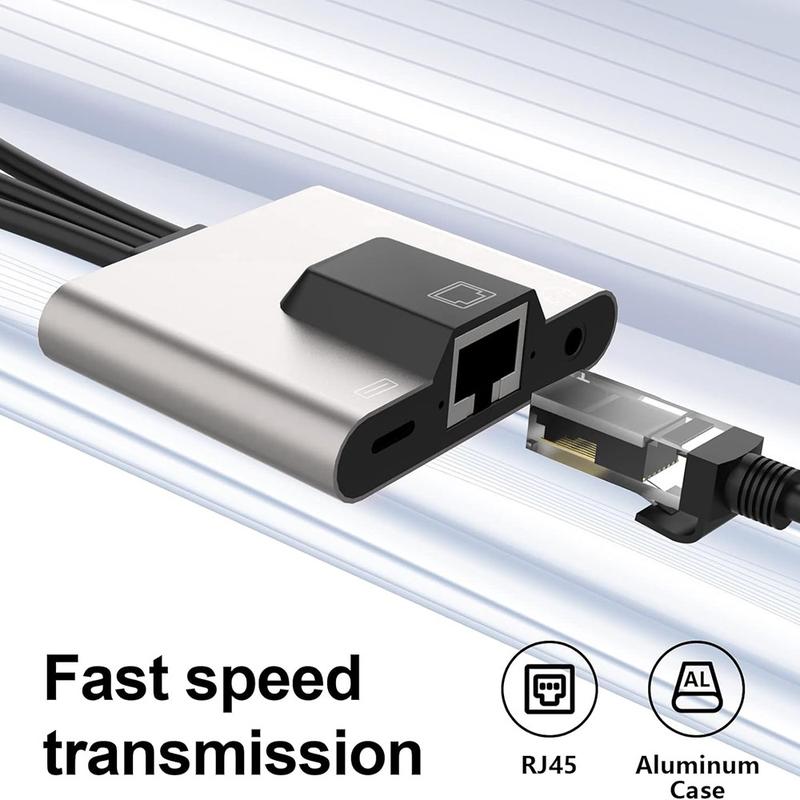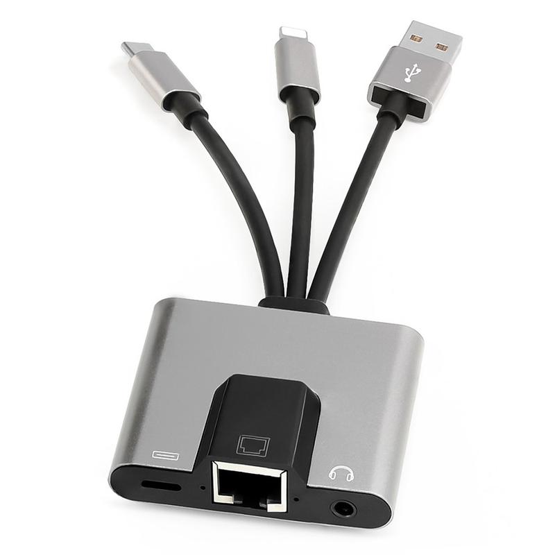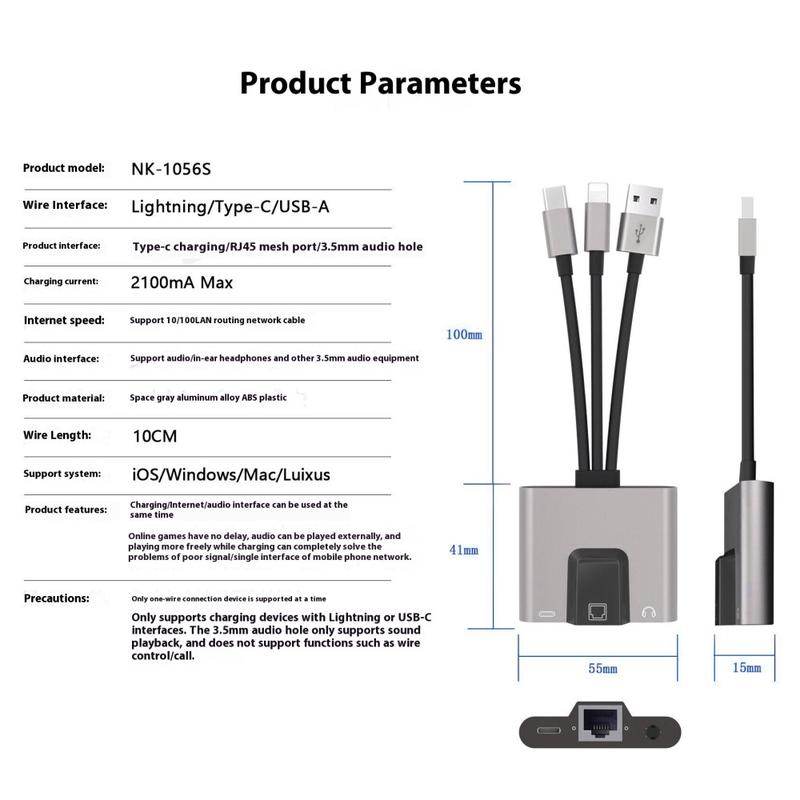 Adaptador Ethernet 3 em 1 NK-1056S - USB-C, USB-A e Lightning, tomada de áudio de 3,5 mm e suporte de carregamento USB-C para Windows, Mac, iPhone e iPad - 10cm