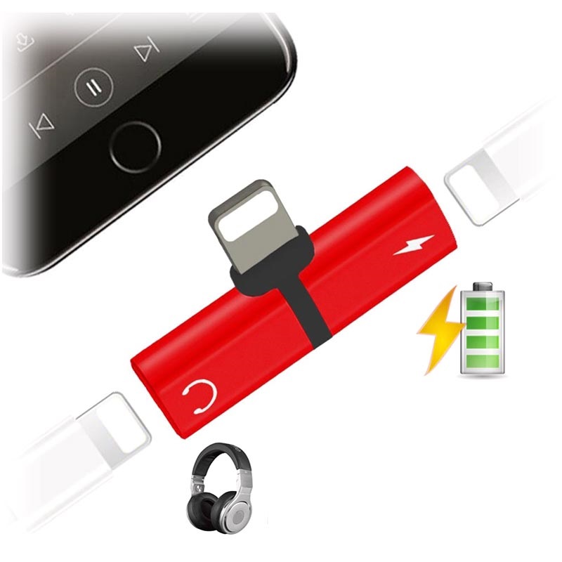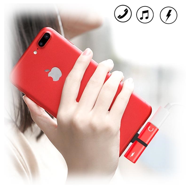 - Um adaptador de áudio e carregamento de alta qualidade com conector Lightning e duas portas
