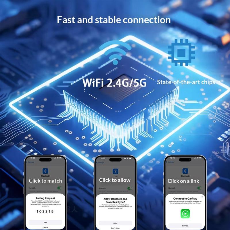O Ultra K15 suporta dispositivos iPhone e Android dentro da gama de compatibilidade indicada, utilizando Bluetooth 5.2 e Wi-Fi de banda dupla 2,4G/5G para a ligação sem fios. De acordo com a informação fornecida, o emparelhamento do telemóvel pode ser concluído em 3 passos, e o adaptador volta a ligar-se automaticamente cerca de 5 a 15 segundos após o arranque do carro. Isto ajuda a criar uma rotina mais conveniente, mantendo a área do painel de instrumentos mais organizada e reduzindo a confusão de cabos.