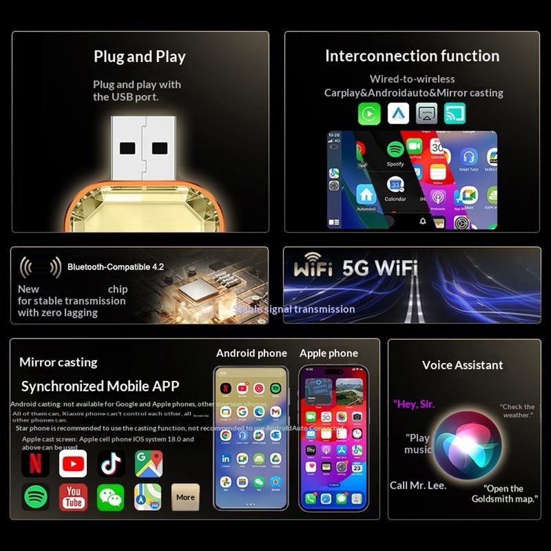 Com Bluetooth 4.2 e Wi-Fi de banda dupla, oferece uma ligação estável e de baixa latência para navegação, chamadas, música e reprodução de vídeos selecionados. A caixa compacta em alumínio anodizado com acabamento diamantado confere-lhe um aspeto premium, enquanto a configuração plug-and-play facilita a sua utilização imediata.