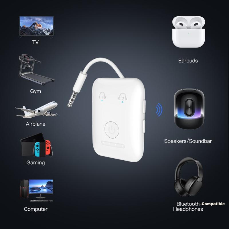 Os transmissores Bluetooth são projetados para enviar áudio de fontes não Bluetooth (como TVs ou ecrãs de aviões) para os seus auscultadores sem fios. O Bluetooth 5.3 pode oferecer maior estabilidade e eficiência em comparação com versões anteriores. Os transmissores de conexão dupla são populares para viagens, pois permitem a audição compartilhada sem divisores ou cabos extras.