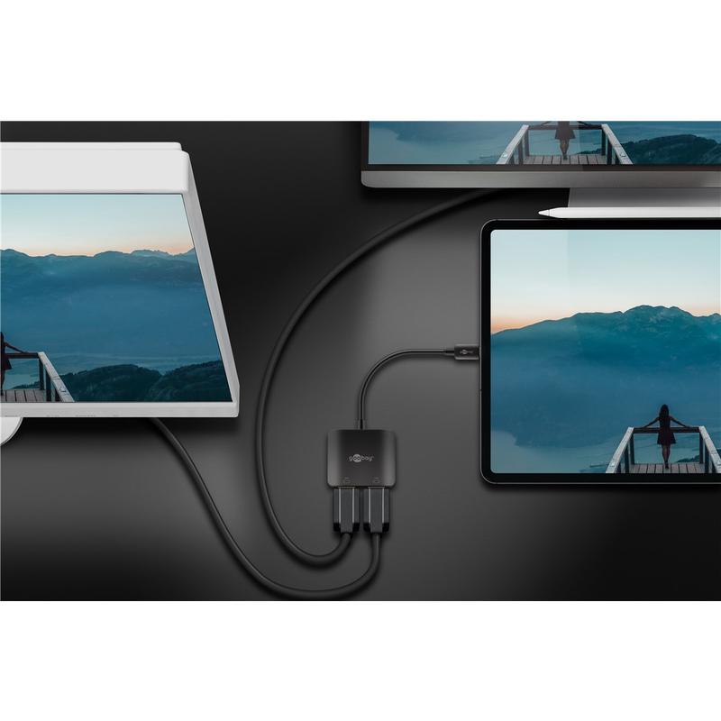 Adaptador para monitor de flera para att spegla dados, ljudoch videosignaler de USB-C™ até upp até 2 HDMI™-portar, Möjliggör t.ex. Sincronização de até 2 canais samtidigt via HDMI™, Lâmpada para adaptadores com USB-C™-contact, Navet stöder maximala skärmupplösningar på 2x 4K @ 60 Hz i MST-läge under Windows, I SST-läge (Single Stream Transport) macOS stöder upp até 2 x 4K @ 60 Hz, Tack vare Plug & Play kan splittern anvandas utan att installera driver. Stödjer HDR (High Dynamic Range) para imagens com alto contraste samt HDCP 1.4 e 2.2 para skyddad signaloverföring