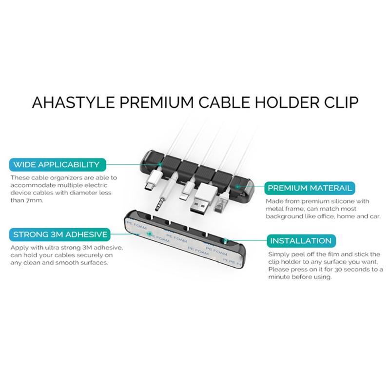 AHASTYLE PT125 Organizador de cabos em liga de alumínio + silicone Gestão de cabos do carregador Suporte de cabos com 5 ranhuras para secretária do escritório em casa - Preto
