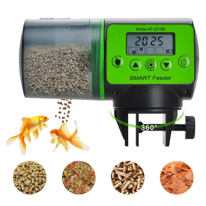 Viaje sem preocupações, porque os seus peixes serão alimentados! Este alimentador inteligente de peixes permite-lhe configurar até quatro tipos de alimentações automáticas por dia ou por noite. Concebido com um grande ecrã LCD para visualizar toda a informação necessária, e também o nível da bateria.