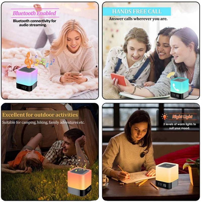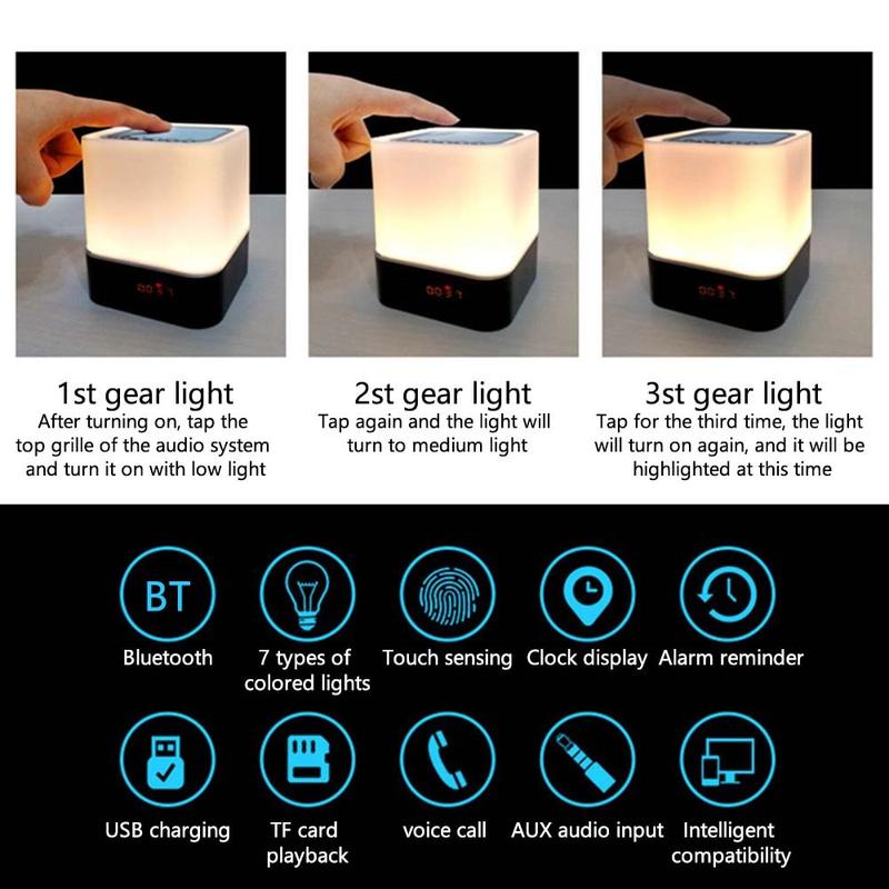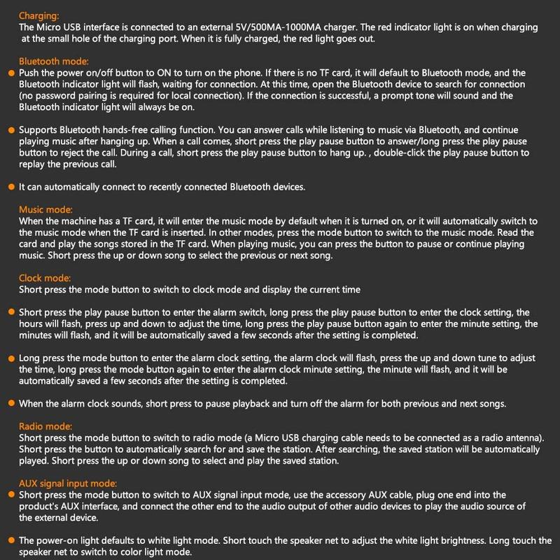 Características: Relógio, despertador, áudio sem fios Bluetooth, cartão TF, reprodução de disco U, suporte de entrada de áudio com fios, pode ser ligado à TV, computador, tablet, telemóvel e outras fontes de áudio