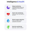 - Rastreamento abrangente de saúde por meio do aplicativo Smart Health - Monitora a frequência cardíaca, oxigênio no sangue, qualidade do sono e níveis de atividade.