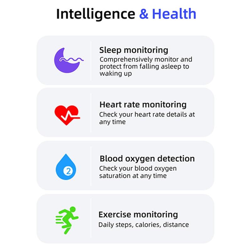 - Rastreamento abrangente de saúde por meio do aplicativo Smart Health - Monitora a frequência cardíaca, oxigênio no sangue, qualidade do sono e níveis de atividade.