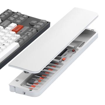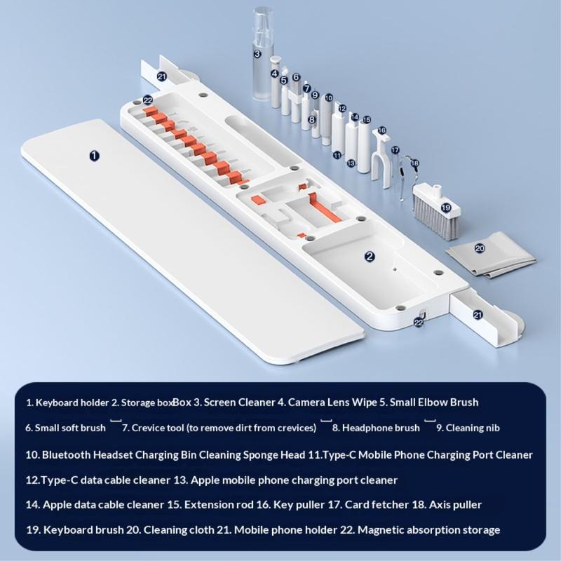No interior do descanso para o pulso encontra-se um kit completo de 22 ferramentas de limpeza concebido para uma limpeza profunda de teclados, auscultadores, portas de carregamento de telemóveis, lentes de câmaras, interruptores e outros dispositivos electrónicos. Cada ferramenta tem o seu próprio lugar, garantindo uma organização fácil e um acesso rápido.