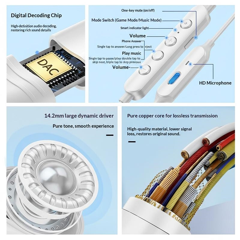 Os auscultadores com fio GC0098 Tipo C foram concebidos para jogos imersivos e para ouvir música no dia a dia, combinando um desempenho de som potente com funcionalidades práticas para uso diário. Equipados com um grande driver dinâmico de 14,2 mm e um chip de descodificação digital integrado, proporcionam um som estéreo Hi-Fi nítido com graves profundos e agudos detalhados. Com modos duplos para jogos e música, uma ligação Type-C estável e um design magnético para evitar emaranhados, estes auscultadores são uma escolha fiável para smartphones, tablets e outros dispositivos Type-C.