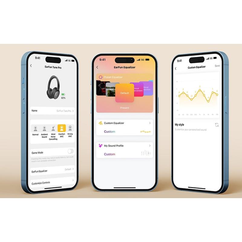 A aplicação Earfun Audio permite-lhe personalizar as definições dos auscultadores. Pode escolher entre 30 modos de equalizador, alterar os modos ANC, verificar os níveis de carga e atualizar o software.