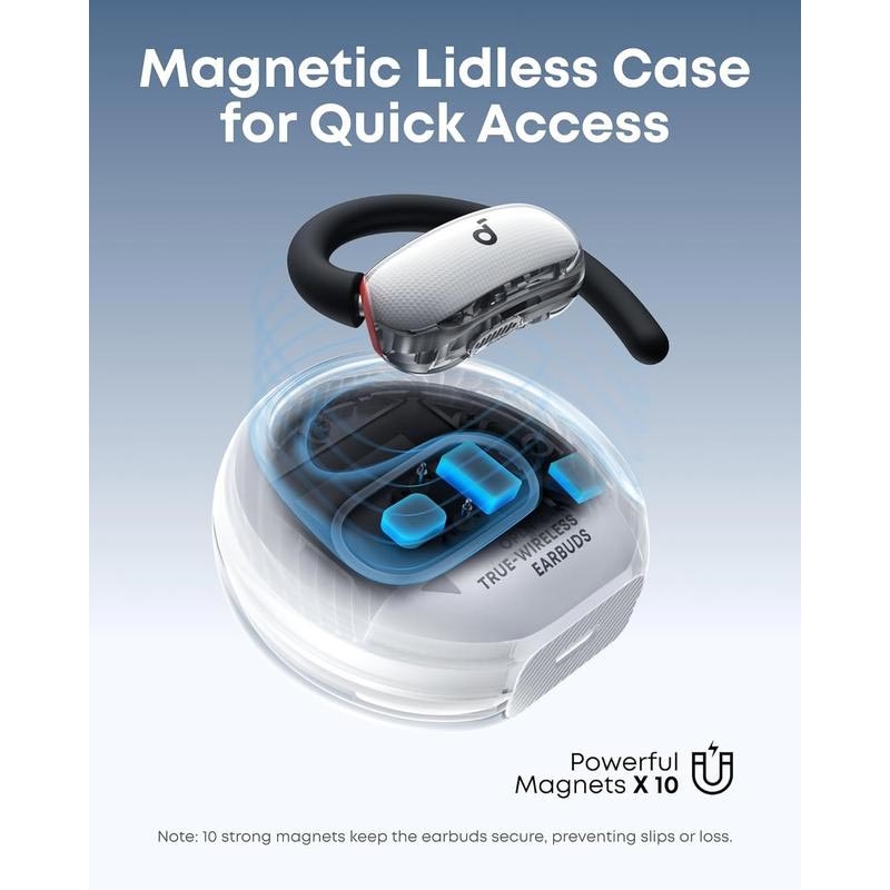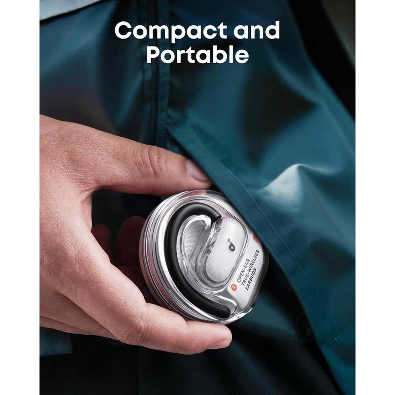 Os auscultadores Soundcore V40i de ouvido aberto foram concebidos para estilos de vida activos em que o conforto, a consciência e a qualidade de som são importantes. Com um design inovador de orelha aberta e ganchos de orelha ajustáveis, assentam confortavelmente fora do canal auditivo, permitindo-lhe desfrutar de música enquanto se mantém atento ao que o rodeia. O estojo de carregamento transparente, elegante e sem tampa, dá um toque moderno e permite um acesso rápido e sem esforço onde quer que esteja.