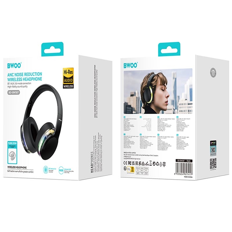 - Auscultadores sem fios BWOO com ANC e luzes RGB