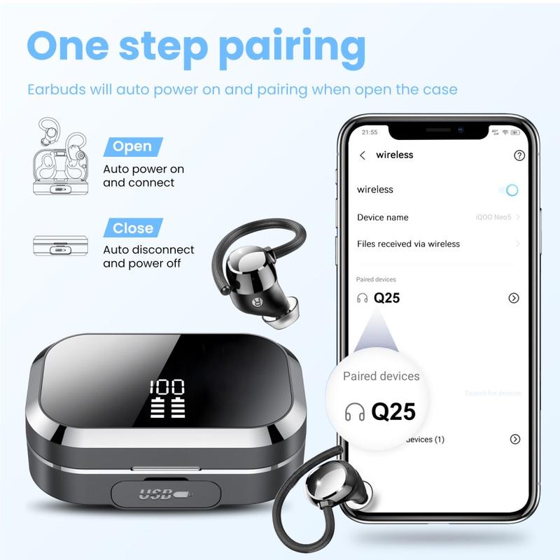 Os auriculares sem fios Q25 foram concebidos para utilizadores que procuram um ajuste mais seguro, uma bateria prática e uma experiência de audição flexível no dia-a-dia, tudo num único dispositivo compacto. Graças ao seu design ergonómico com gancho auricular, mantêm-se confortavelmente no lugar durante os treinos, as deslocações, as caminhadas e o uso diário, enquanto o estojo de carregamento incluído acrescenta uma conveniência extra com a função de power bank integrada. Isto torna os Q25 uma opção inteligente para quem procura mais do que um simples par de auriculares sem fios.