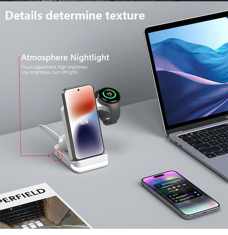 Mantenha os seus dispositivos totalmente alimentados, organizados e o seu espaço iluminado com o carregador sem fios dobrável 3 em 1 B-27.