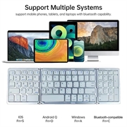 O design inteligente dobrável em três partes facilita o transporte numa mala, mochila ou bolsa de portátil, enquanto o fecho magnético ajuda a mantê-lo bem dobrado durante o transporte. Com suporte para até três dispositivos Bluetooth, pode alternar facilmente entre o seu telemóvel, tablet e portátil utilizando as teclas dedicadas BT1, BT2 e BT3. Isto torna o teclado especialmente útil para multitarefas em diferentes dispositivos e sistemas operativos.