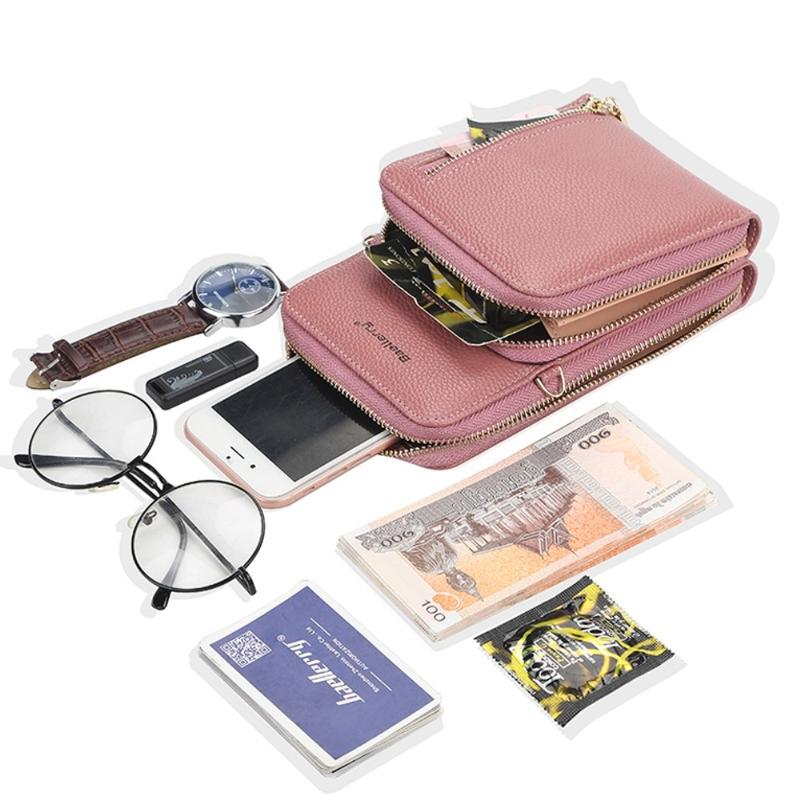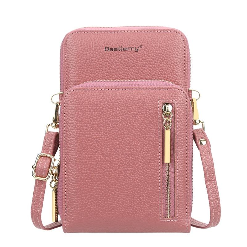 BAELLERRY N0110 Carteira com fecho de correr de camada dupla para mulher Bolsa para telemóvel em pele PU com alça de ombro - Rosa profundo