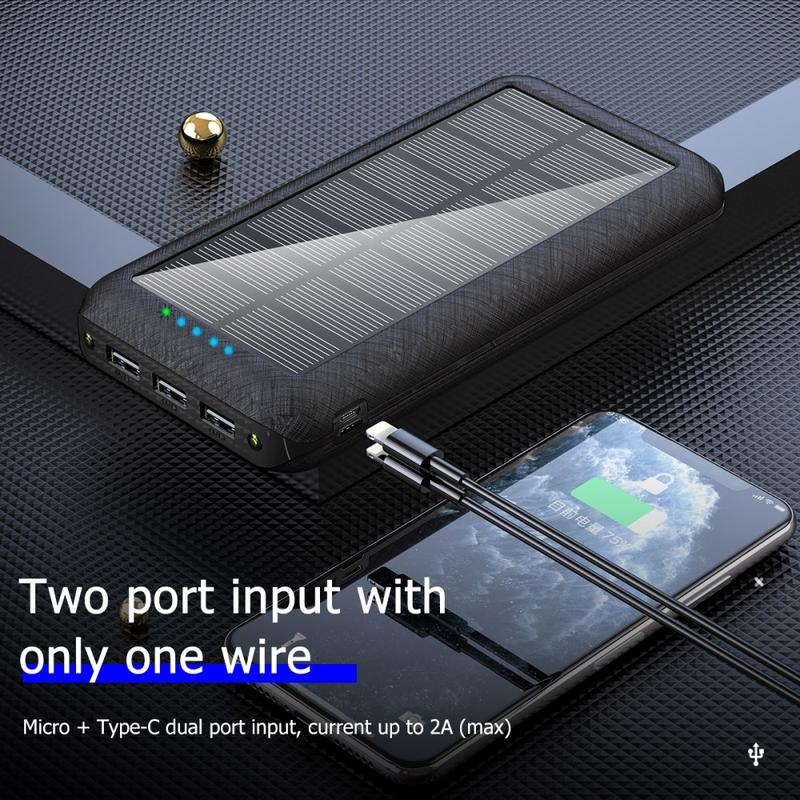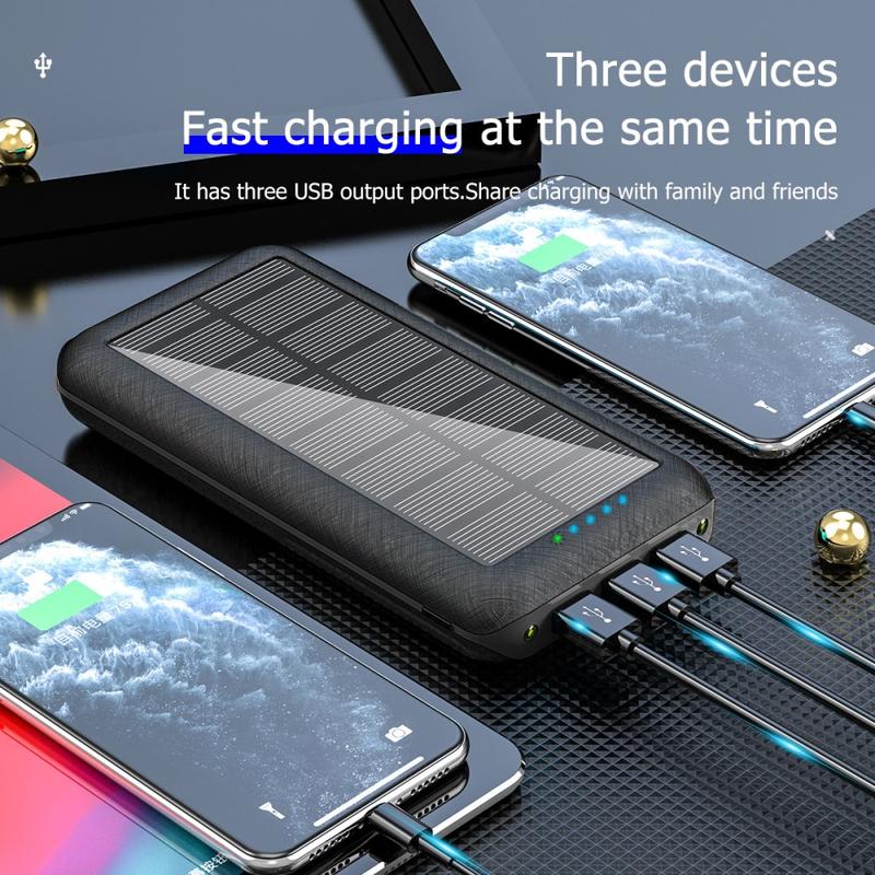 Banco de energia solar 20000mAh com carregamento sem fios, 3 portas USB, lanterna LED dupla