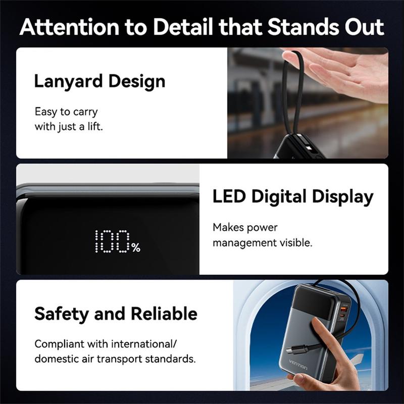 Banco de potência Vention FHYB0 20000mAh com cabo USB-C integrado - Mantenha-se alimentado em qualquer lugar