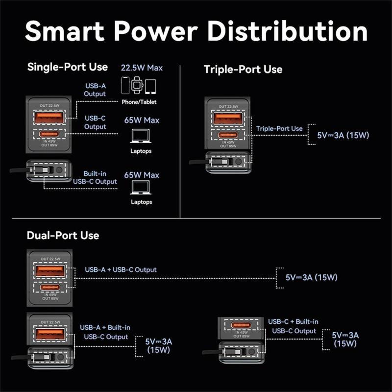- Saídas máximas: USB-C 65W; USB-A 22,5 W; cabo integrado 65W.