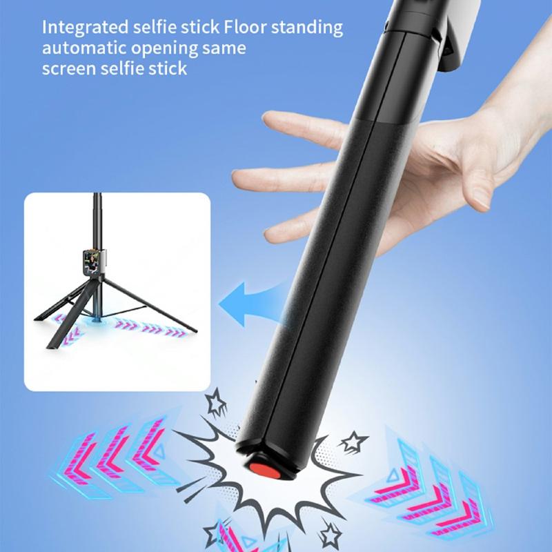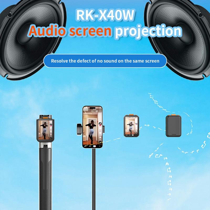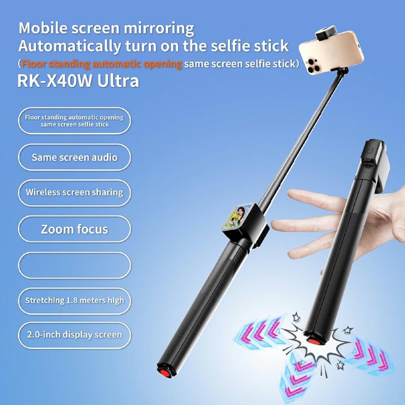 RK-X40W Bastão de selfie e tripé para smartphone com suporte de abertura automática, espelhamento de ecrã de 2,0 polegadas, WiFi e Bluetooth