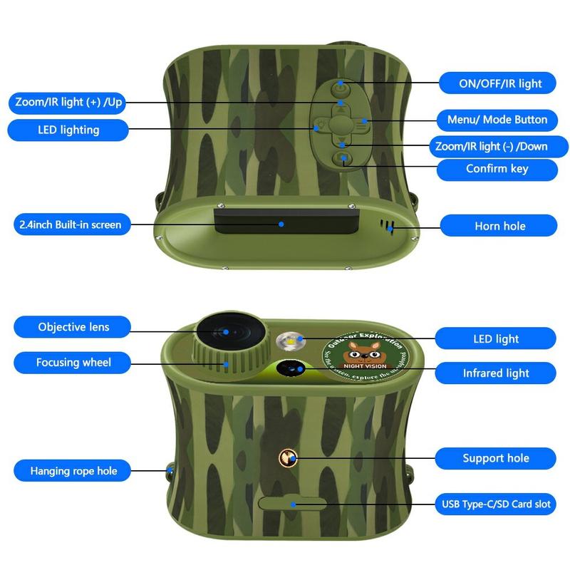 Binóculos digitais de visão nocturna DT15 2.5K com câmara para crianças - Fotos de 48MP, zoom digital de 8x + zoom ótico de 4x, ecrã IPS de 2,4", IR de 850 nm (7 níveis), USB-C, bateria de 2200mAh