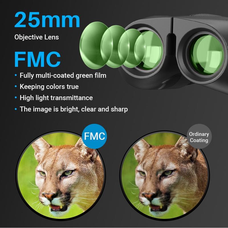 Equipados com prismas BAK4 e lentes FMC (Fully Multi-Coated), estes binóculos proporcionam imagens brilhantes, nítidas e de elevado contraste com uma excelente fidelidade de cores. A ocular de 16 mm e a lente objetiva de 25 mm proporcionam um amplo campo de visão de 112 m / 1000 m (6,2°), oferecendo uma experiência de visualização confortável e estável com distorção mínima e sem tonturas.