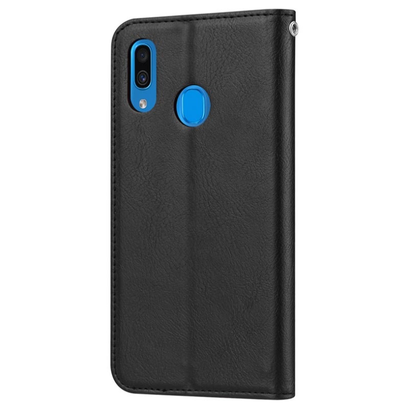 - Uma bolsa tipo carteira premium com uma divisória frontal para o Samsung Galaxy A20e