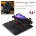 A bolsa tipo carteira 2 em 1 DG.Ming para o Samsung Galaxy S25 Ultra é uma excelente combinação entre uma bolsa fólio e uma capa magnética removível. Esta bolsa é multifuncional, com ranhuras para cartões e um bolso para dinheiro, e mantém tudo no lugar. O fecho de encaixe de metal adiciona segurança extra e torna possível usar a bolsa como um suporte para visualização de conteúdos multimédia sem as mãos. O seu excelente design, revestido com couro curtido, adapta-se bem à mão.