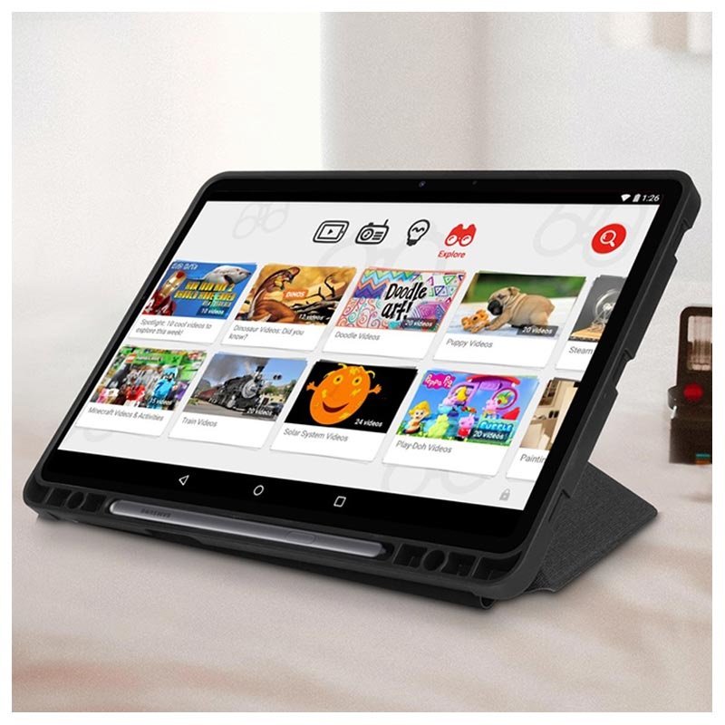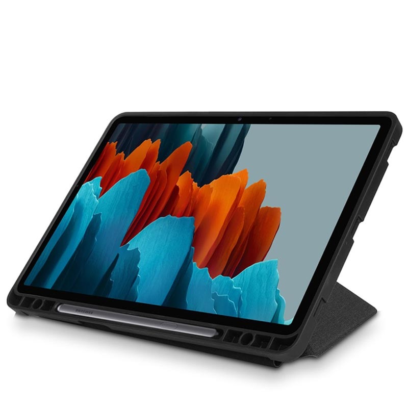 Esta bolsa é feita de poliuretano e TPU de alta qualidade, com uma aparência simples e na moda. Foi concebida para proteger o seu Samsung Galaxy Tab S7+, Galaxy Tab S8+ e tem um suporte de origami que lhe proporciona múltiplos ângulos de visualização e digitação. Graças à função inteligente de despertar/suspender, esta bolsa fólio liga ou desliga automaticamente o ecrã quando abre ou fecha a aba.
