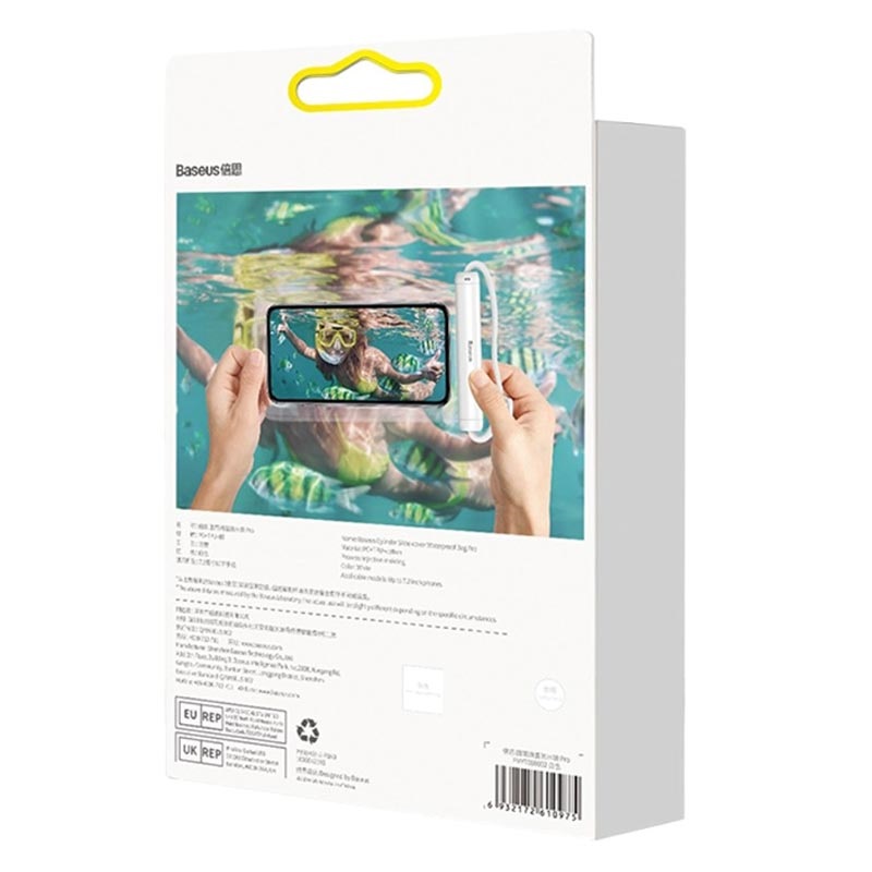 A bolsa impermeável Baseus Cylinder Slide possui uma fita em algodão para o pescoço, que lhe permite nadar ou mergulhar confortavelmente com o seu smartphone. A classificação IPX8 de impermeabilidade significa que o seu smartphone permanece completamente seco e sem danos.
