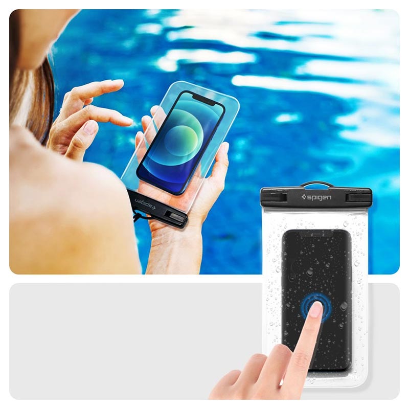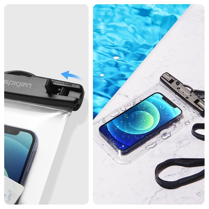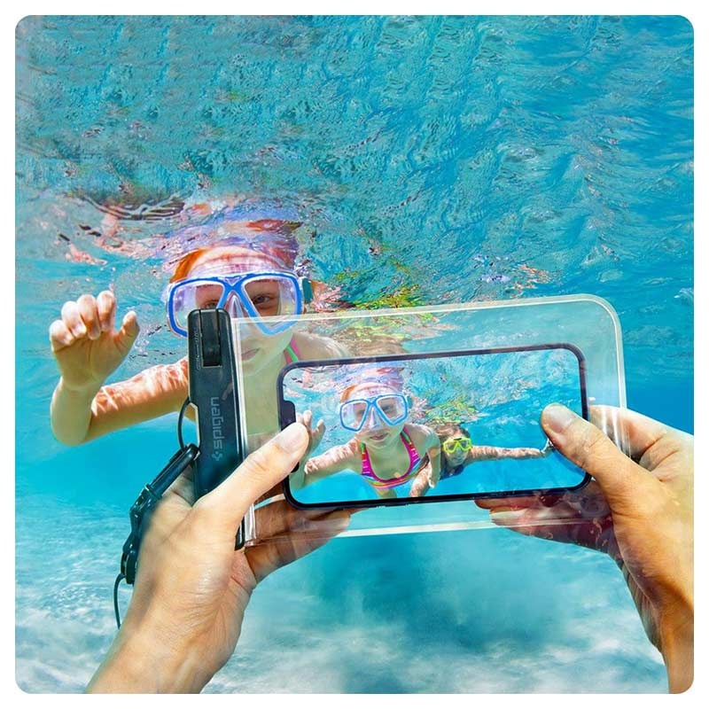 - Bolsa completamente selada e impermeável para smartphones até 6.8", da Spigen