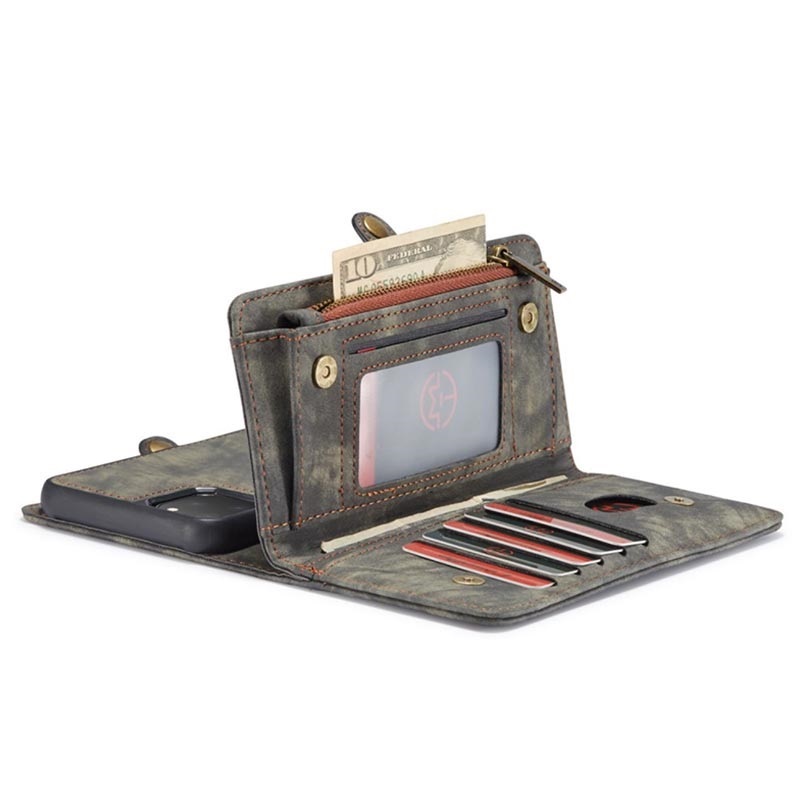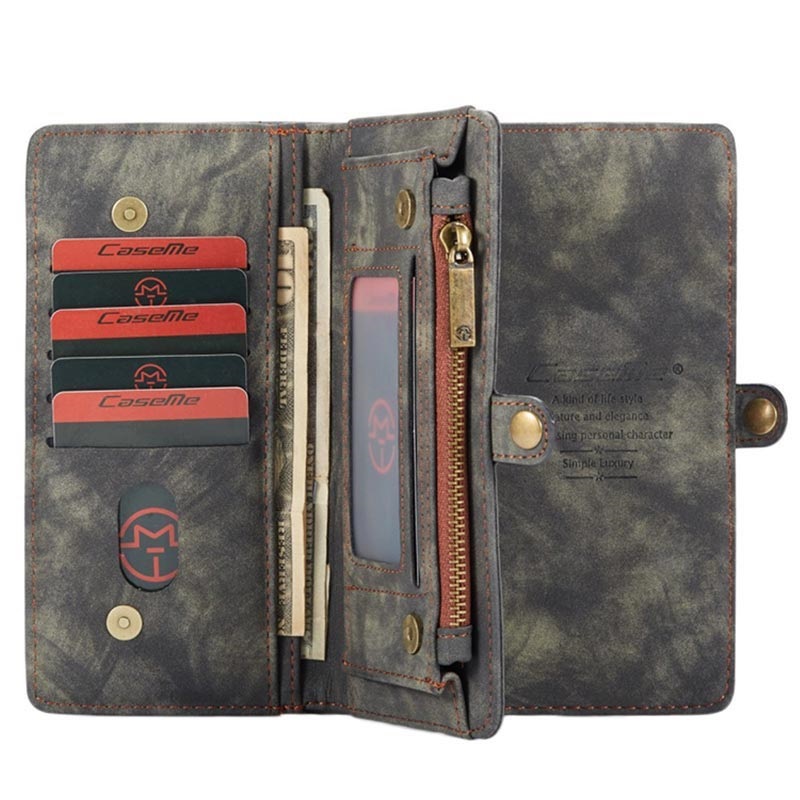 A capa CaseMe 2 em 1 ostenta uma fantástica capa de 11 ranhuras para cartões, 3 ranhuras para dinheiro e até um pequeno compartimento com um fecho de correr. A própria capa tipo carteira é forrada com couro rachado, dando-lhe um aspeto e toque elegante e de alta qualidade.