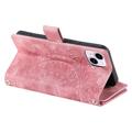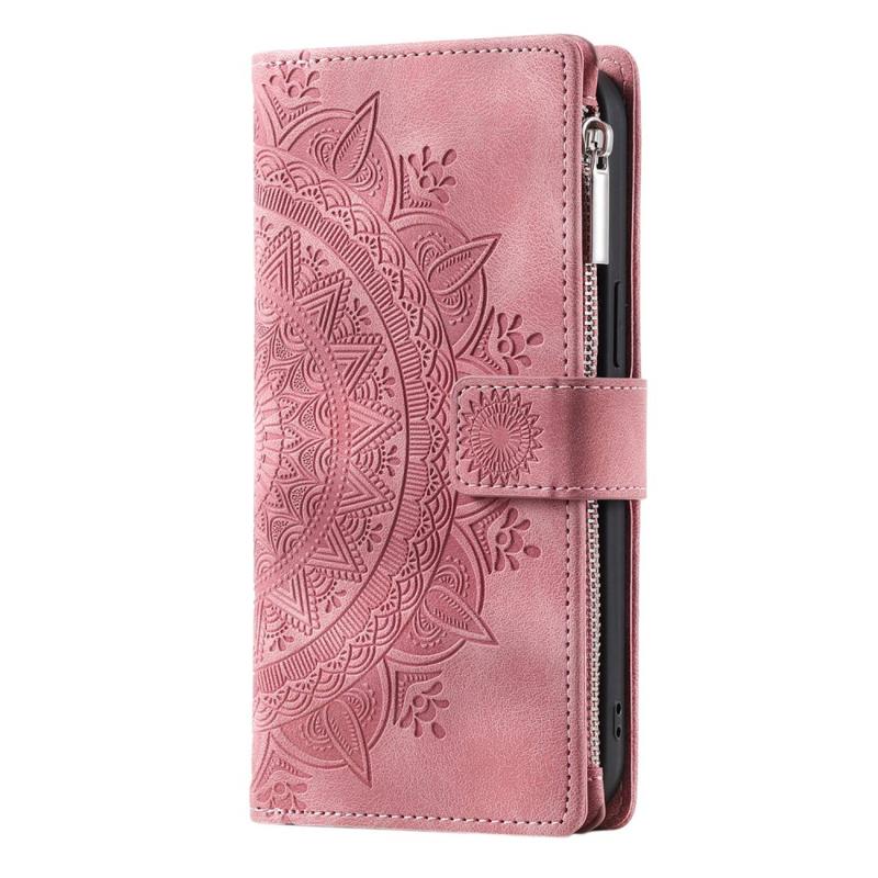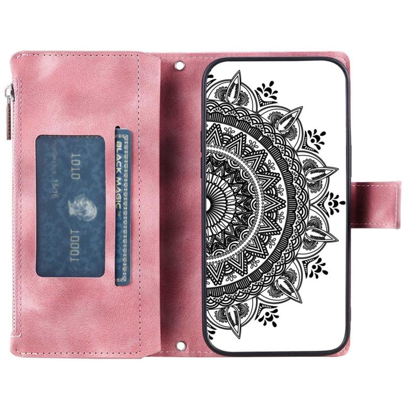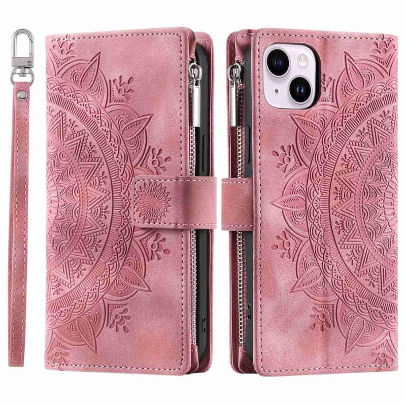 Estojo de telefone para iPhone 14 Plus, suporte de capa de couro PU com impressão de flor de mandala anti-riscos com vários compartimentos para cartão com bolso e bolso com zíper