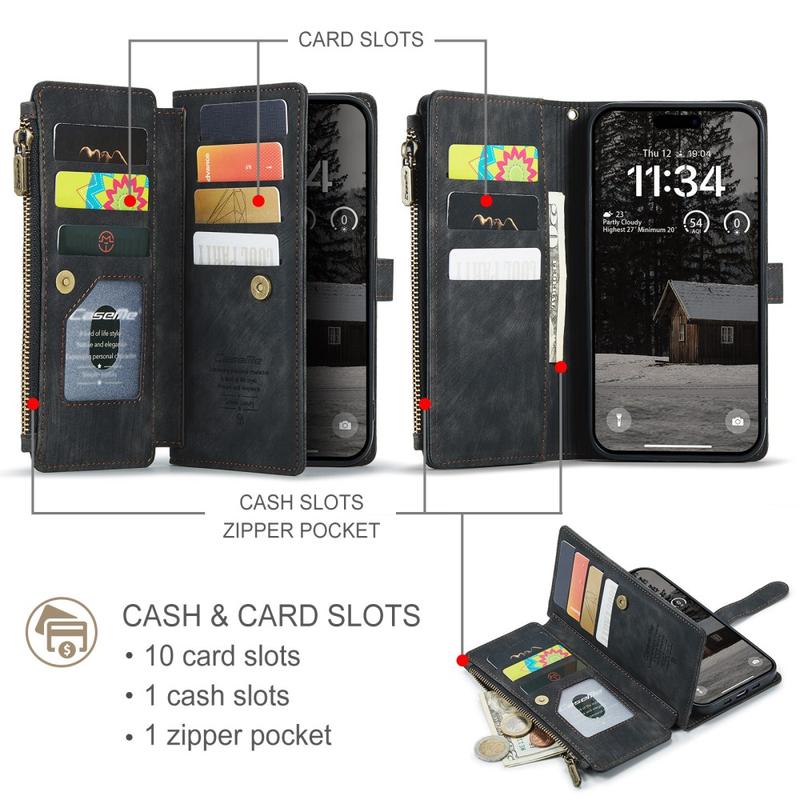 A bolsa estilo carteira multifuncional Caseme C30 para o iPhone Air traz uma proteção excecional e um design exclusivo e refinado. Esta elegante bolsa é feita de poliuretano de primeira categoria e reforçada com uma capa interior em TPU resistente a choques que aconchega perfeitamente o seu iPhone Air. Ao mesmo tempo, a bolsa tipo carteira Caseme C30 é melhorada com numerosas divisórias para cartões, um grande compartimento para dinheiro no interior, e um bolso exterior com fecho de correr, tudo protegido por um fecho magnético seguro.