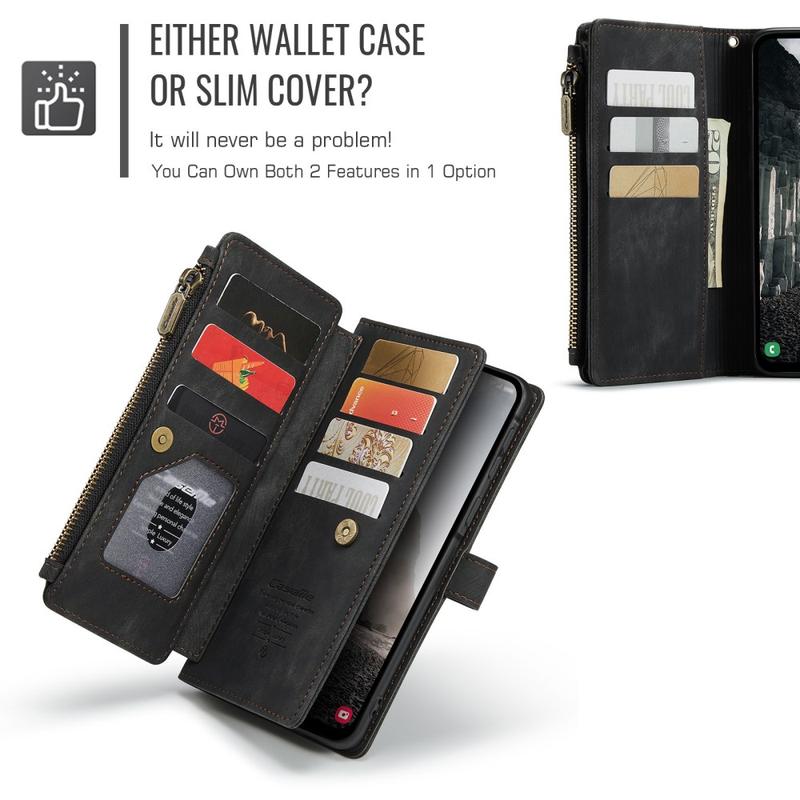A bolsa estilo carteira multifuncional Caseme C30 para o Samsung Galaxy A56 traz uma proteção excecional e um design exclusivo e refinado. Esta elegante bolsa é feita de poliuretano de primeira categoria e reforçada com uma capa interior em TPU resistente a choques que aconchega perfeitamente o seu Samsung Galaxy A56. Ao mesmo tempo, a bolsa tipo carteira Caseme C30 é melhorada com numerosas divisórias para cartões, um grande compartimento para dinheiro no interior, e um bolso exterior com fecho de correr, tudo protegido por um fecho magnético seguro.