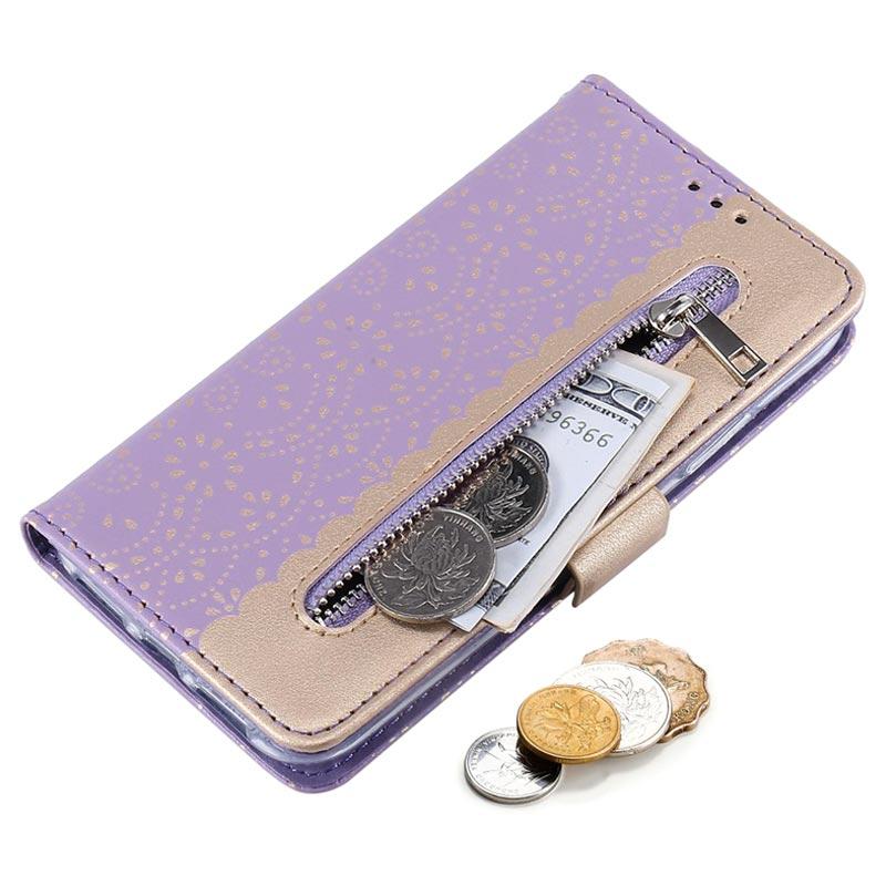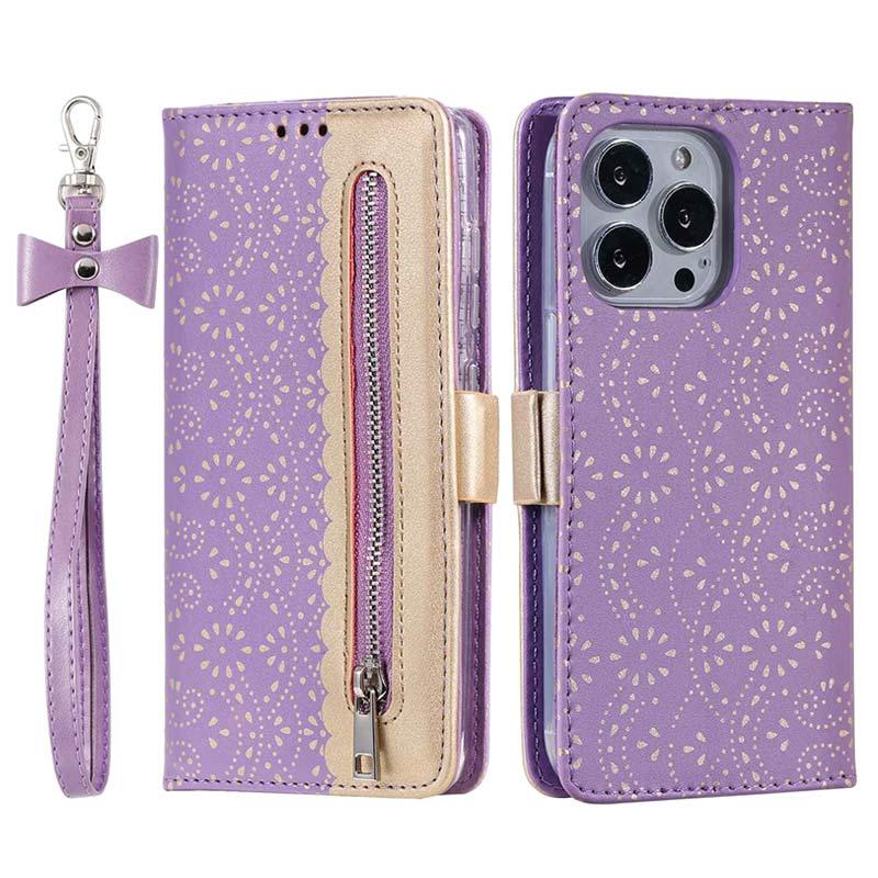 Esta bolsa tipo carteira é incrivelmente elegante devido ao seu padrão rendado, e protege o seu iPhone 14 Pro Max de danos, sendo que o bolso frontal com fecho lhe permite guardar notas e moedas.