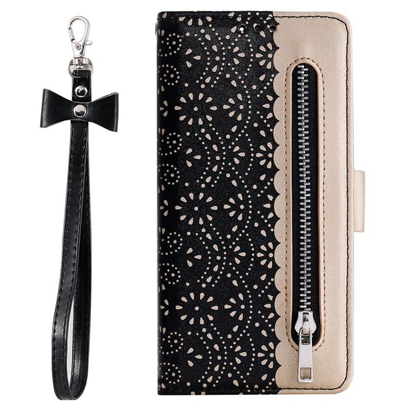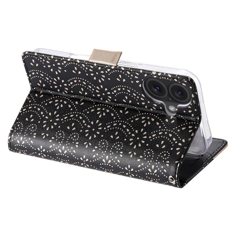 Esta bolsa tipo carteira incrivelmente elegante com padrão rendado protege o seu iPhone 16 Plus de danos e o bolso frontal com fecho permite guardar dinheiro.