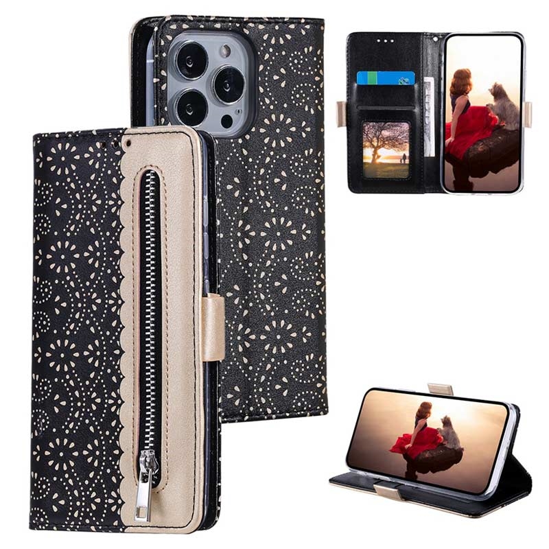 Esta bolsa tipo carteira incrivelmente elegante com padrão rendado protege o seu iPhone 16 Pro Max de danos e o bolso frontal com fecho permite guardar dinheiro.