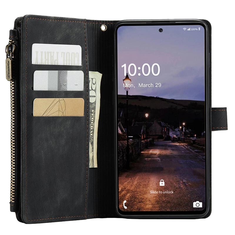 Esta bolsa estilo carteira multifuncional para o Samsung Galaxy A33 5G vai deixá-lo sem palavras! Concebida com dez divisórias para cartões, um compartimento para dinheiro e um bolso com fecho de correr - o suficiente para levar os seus essenciais para onde quer que vá! É feita de poliuretano de qualidade com TPU no interior, e mantida segura através de um fecho magnético. Além disso, vem com uma alça de mão para uso descontraído, e pode ser usada como um suporte para desfrutar da visualização de vídeos em mãos livres.