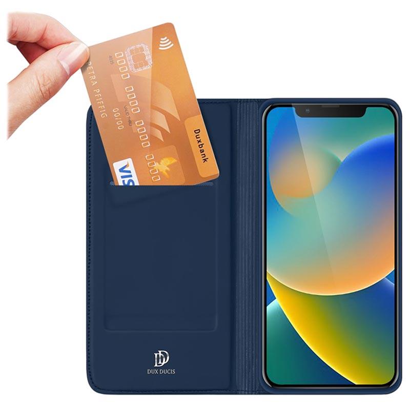 - A bolsa estilo flip Dux Ducis para o iPhone 14 contém uma ranhura para cartões