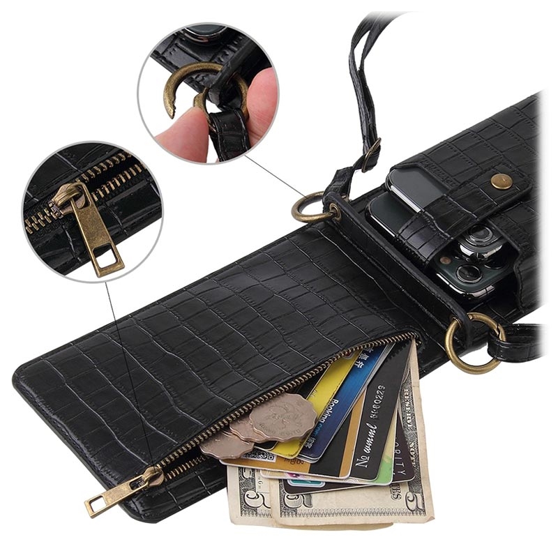- Compartimento de telefone separado, bolso com zíper e vários slots de cartão