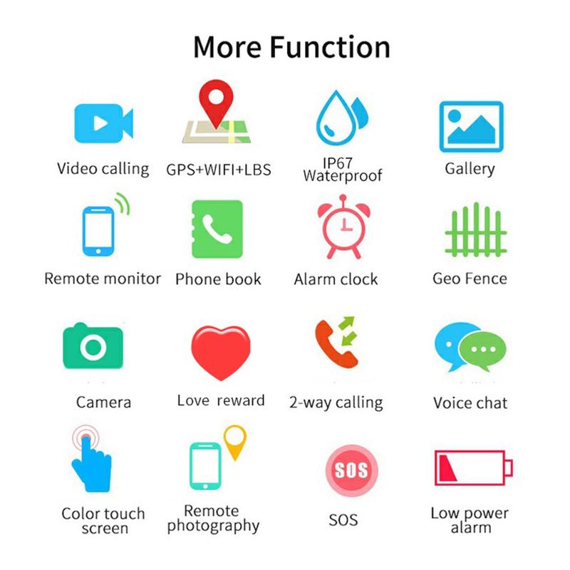 - Função APP: Lista telefónica, intercomunicador, marcação de telefone, passo, despertador, posição, centro de informação, recompensas de amor, fotos remotas, videochamadas, lembrete SOS, trabalho, membros da família, uma aula, alertas SMS, LBS, encontrar relógio, alternar Configurações, idioma, fuso horário, a recolha de relógios SMS, recusou chamadas estranhas, desligamento remoto, reinício remoto e redefinição do dispositivo
