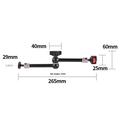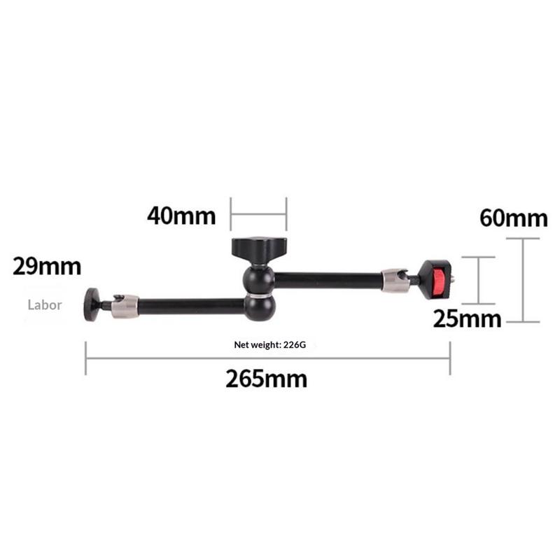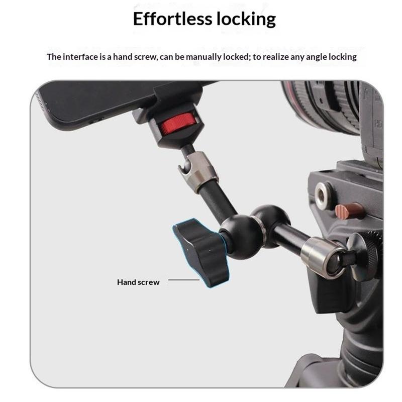 O design com cabeça esférica dupla permite um ajuste de 360° para um posicionamento mais preciso, enquanto a rosca padrão de 1/4" em ambas as extremidades o torna compatível com uma vasta gama de equipamentos. Fabricado em liga de alumínio, o braço oferece uma construção sólida e duradoura, mantendo-se suficientemente leve para um transporte fácil e utilização diária.